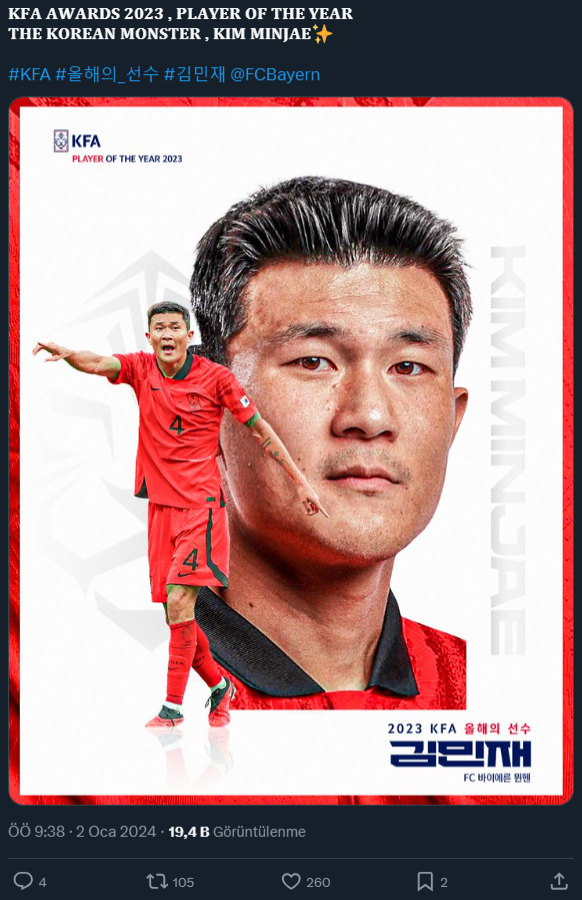 Kariyerini Bayern Münih'te sürdüren Fenerbahçe'nin eski stoperi Kim Min-Jae, Heung Min-Son'u geçerek Güney Kore Futbol Federasyonu tarafından 'Yılın Futbolcusu' olmaya hak kazandı.