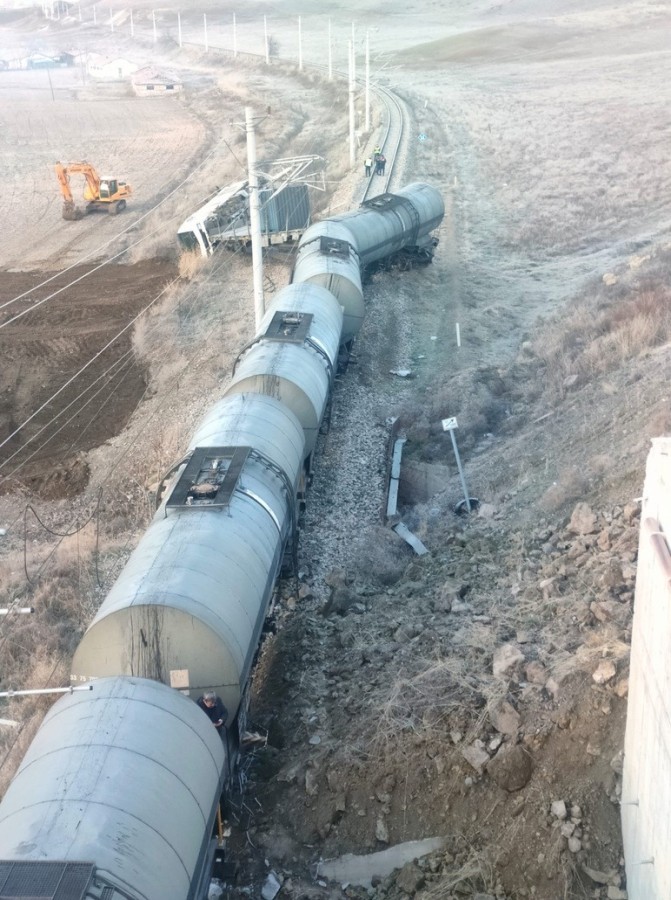 Kırıkkale'de istinat duvarının yıkılması neticesinde rayların üzerine akan dolgu malzemesine çarpan yük treni raydan çıktı.