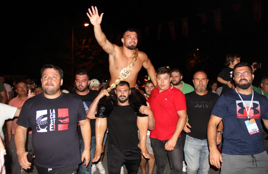 Antalyalı başpehlivan Zeybek, boynunda altın kemeri ile omuzlarda sokakları gezerek Edirnelileri selamladı.