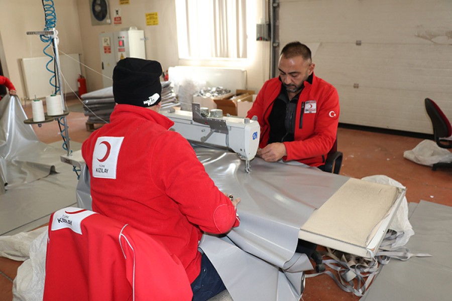 Kahramanmaraş merkezli 10 ili etkileyen depremlerin ardından Türk Kızılay Erzincan Çadır Üretim Atölyesi'nde yoğun çalışma yürütülüyor.