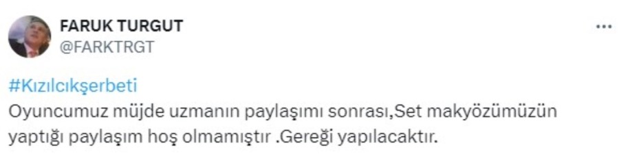 Yayınlanan videodan rahatsız olan Turgut X hesabından yaptığı paylaşımda "Oyuncumuz Müjde Uzman'ın paylaşımı sonrası set makyözümüzün yaptığı paylaşım hoş olmamıştır. Gereği yapılacaktır" ifadelerini kullandı. Makyöz Esra Okumuş Şahin'in işine son verileceği öğrenildi.