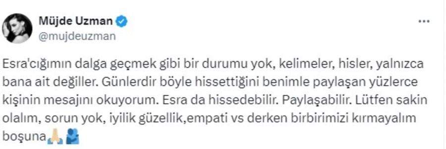 Görüntü kısa sürede gündem olunca Müjde Uzman da bir paylaşım yaparak "Esra'cığımın dalga geçmek gibi bir durumu yok, kelimeler, hisler, yalnızca bana ait değiller. Günlerdir böyle hissettiğini benimle paylaşan yüzlerce kişinin mesajını okuyorum. Esra da hissedebilir. Paylaşabilir. Lütfen sakin olalım, sorun yok, iyilik güzellik, empati vs derken birbirimizi kırmayalım boşuna" dedi.