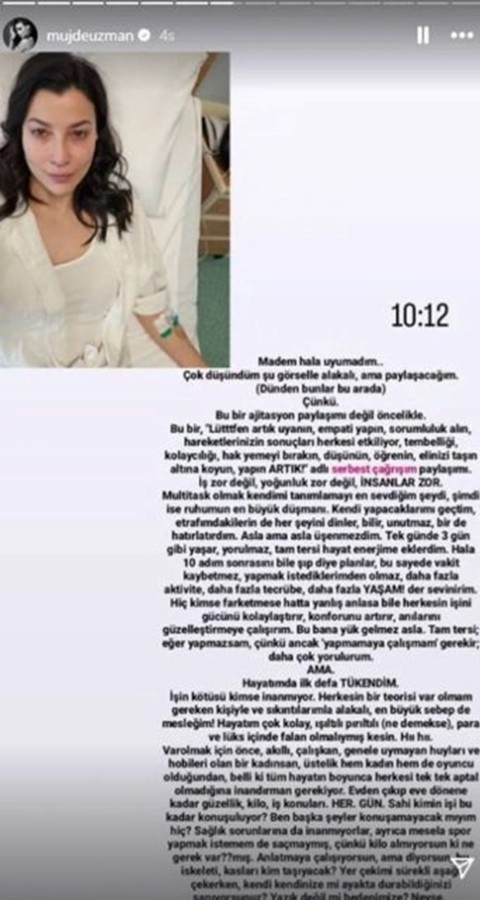 Uzman, paylaşımında "Hayatımda ilk defa tükendim. İşin kötüsü kimse inanmıyor. Herkesin bir teorisi var olmam gereken kişiyle ve sıkıntılarımla alakalı, en büyük sebep de mesleğim! Hayatım çok kolay, ışıltılı pırıltılı (ne demekse), para ve lüks içinde falan olmalıymış kesin. Sahi kimin işi bu kadar konuşuluyor? Ben başka şeyler konuşamayacak mıyım hiç? Sağlık sorunlarına da inanmıyorlar. 30 senelik arkadaşlarım, ruhumu besleyen alışkanlıklarımı, özgürlüğümü geri verin. Ruhum o kadar sıkıştı ki, bedenimde de sıkışmayan, hastalanmayan, ağrımayan yer kalmadı. Ağaçsızlıktan, denizsizlikten insanlıksızlıktan hastayım, yastayım, hiç kimse görmüyor. Bilin bakalım neyim yok? Mecalim!" ifadelerini kullanmıştı.