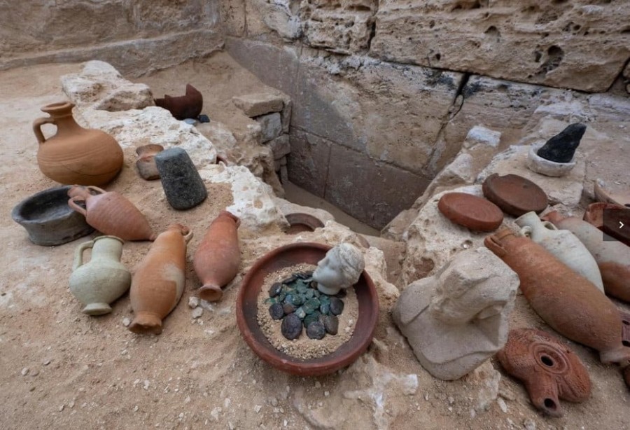 Araştırmacılar ayrıca birçoğu Kleopatra VII'nin bir resmini, bir çanak çömlek setini, yağ lambalarını, yiyecek ve kozmetik koruma amaçlı kireç taşı kaplarını, birkaç bronz heykel ve "Ra'nın adaleti yükseldi" ifadesinin kazındığı bir muskayı gösteren yaklaşık 350 sikke buldu. Tanrıça Hathor'a adanmış bir bronz yüzük de ortaya çıkarıldı.