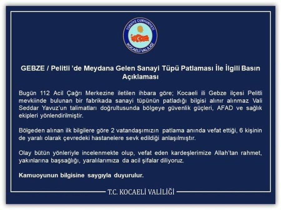 "Bugün 112 Acil Çağrı Merkezine iletilen ihbara göre, Gebze Pelitli mevkiinde bulunan bir fabrikada sanayi tüpünün patladığı bilgisi alınır alınmaz Vali Seddar Yavuz'un talimatları doğrultusunda bölgeye güvenlik güçleri, AFAD ve sağlık ekipleri yönlendirilmiştir. Bölgeden alınan ilk bilgilere göre 2 vatandaşımızın patlama anında vefat ettiği, 6 kişinin de yaralı olarak çevredeki hastanelere sevk edildiği anlaşılmıştır. Olay bütün yönleriyle incelenmekte olup, vefat eden kardeşlerimize Allah'tan rahmet, yakınlarına başsağlığı, yaralılarımıza da acil şifalar diliyoruz."