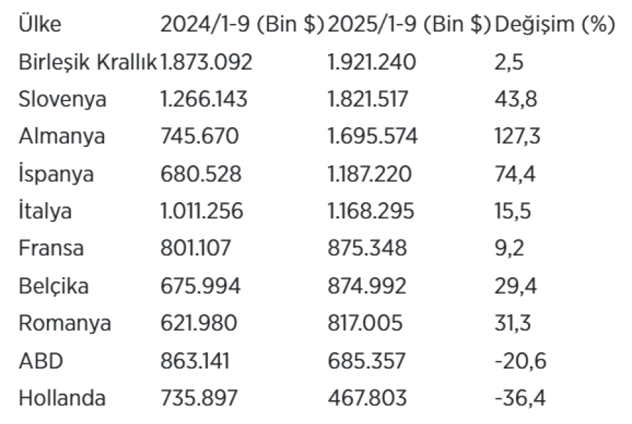 Kentten yapılan ihracatın 2024'ün ocak-eylül dönemine göre yüzde 43,8 arttığı Slovenya, 1 milyar 821 milyon 517 bin dolarla ikinci sırada yer aldı.