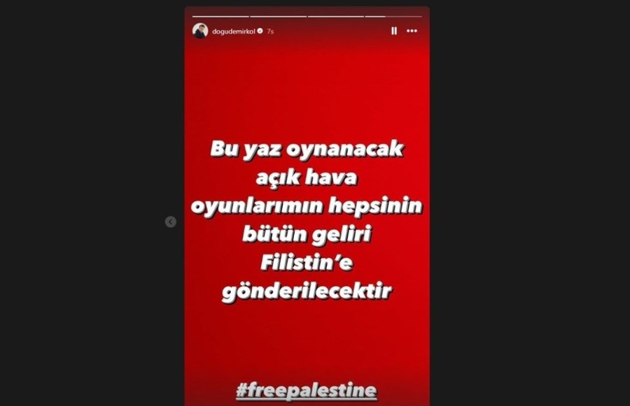 Oyuncu ve komedyen Doğu Demirkol'dan, Instagram hesabından yaptığı paylaşımda, yaz boyunca gerçekleştirilecek açık hava gösterilerinin gelirlerini Filistin'e bağışlayacağını duyurdu.