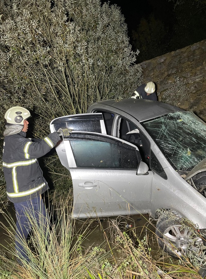 Ceyda Sinem S.'nin ani manevra yapmasına rağmen köpeğe çarptıktan sonra yoldan çıkan otomobil, dere yatağına düştü.