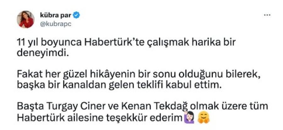 Gazeteci Kübra Par, Habertürk'ten ayrıldığını duyurdu.