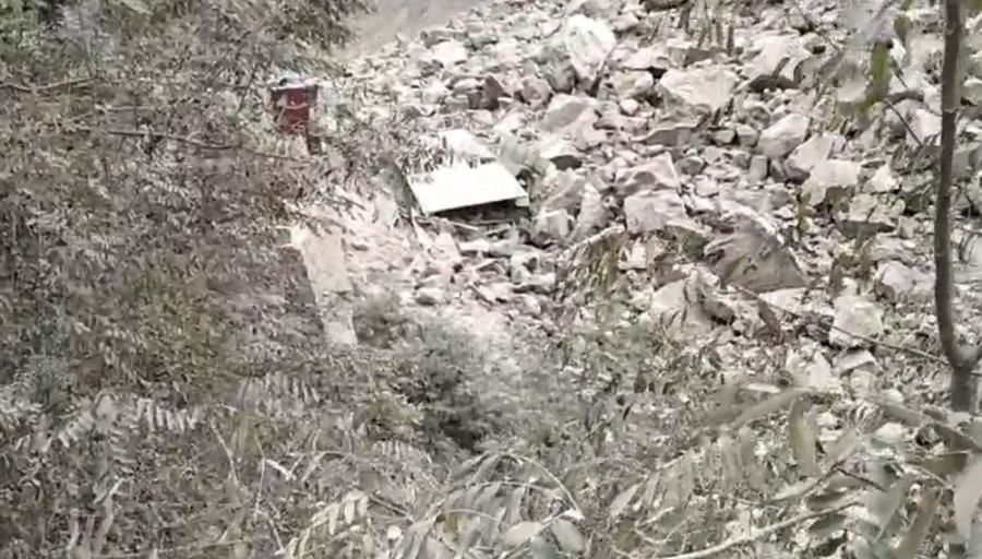 Dik yamaçtan kopan büyük kaya parçaları, taş ocağında ve mahalle yolunda hasara yol açtı.