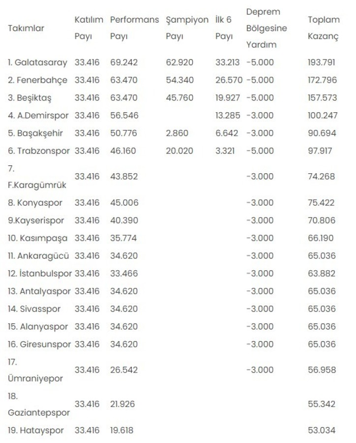 * İlk 6 payında lig şampiyonu Galatasaray 33 milyon 213 bin lira, lig ikincisi Fenerbahçe 26 milyon 570 bin lira, lig üçüncüsü Beşiktaş 19 milyon 927 bin lira, lig dördüncüsü Adana Demirspor 13 milyon 285 bin lira, lig beşincisi Başakşehir 6 milyon 642 bin lira ve lig altıncısı Trabzonspor 3 milyon 321 bin lirayla ödüllendirildi.