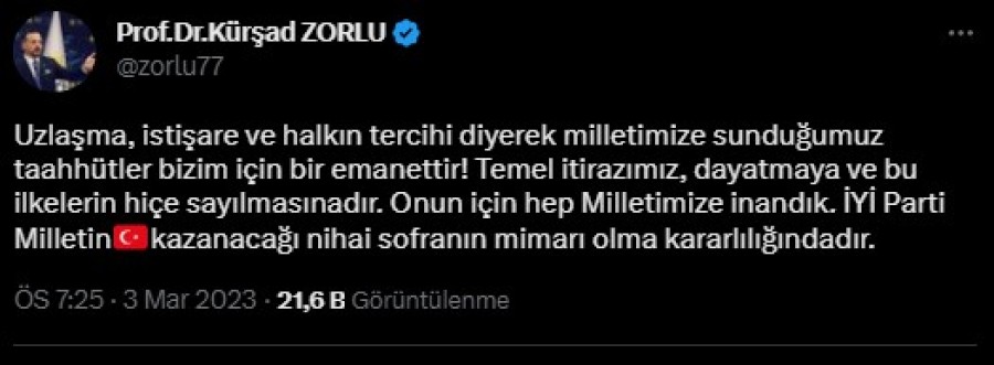 İyi Parti Sözcüsü Kürşad Zorlu, CHP Genel Başkanı Kemal Kılıçdaroğlu, "Soframızı büyütmeye devam edeceğiz. Sabırla..." başlığıyla yaptığı açıklamaya yanıt verdi. Zorlu, "Milletimize inandık. İyi Parti, milletin kazanacağı nihai sofranın mimarı olma kararlılığındadır" ifadesini yazdı.