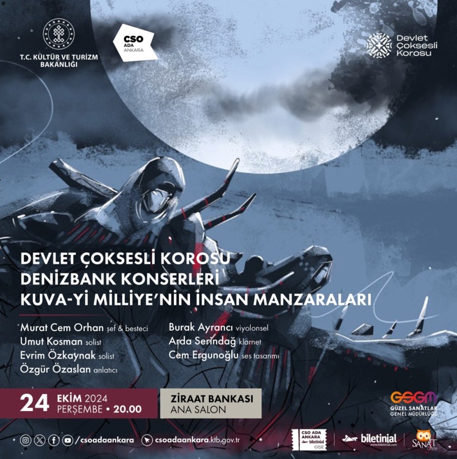 Murat Cem Orhan'ın Nazım Hikmet'in ölümsüz eseri "Kuvâ-yi Milliye Destanı"ndan esinlenerek bestelediği "Kuvâ-yi Milliye'nin İnsan Manzaraları" isimli oratoryosu, 24 Ekim akşamı Devlet Çoksesli Korosu ve oda müziği grubu ile sahneye taşınacak. Bu özel performans, Kurtuluş Savaşı'nın ateşten günlerini, Nazım'ın dizelerindeki umut dolu anılarını ve Anadolu'nun isimsiz kahramanlarının hikâyelerini sanatseverler ile buluşturacak.