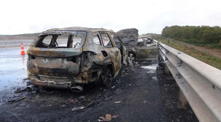 Bariyerlere savrulan iki otomobil ise alev aldı. Otomobillerde bulunan 4 kişi kendilerini dışarıya attı.