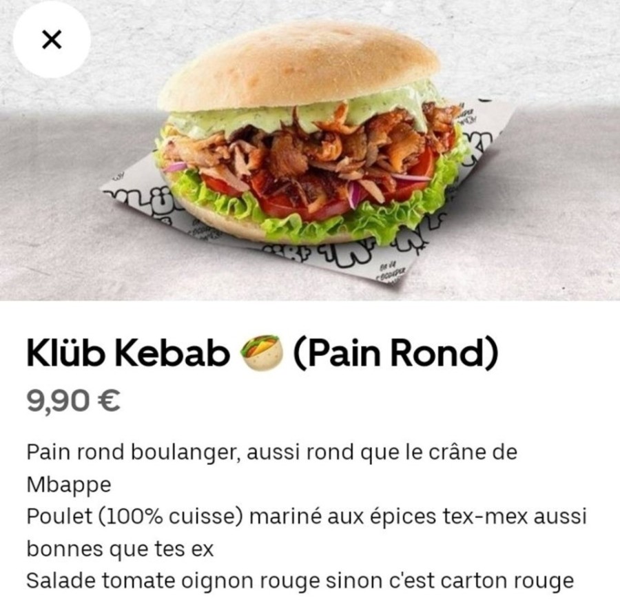 Yıldız oyuncunun isminin yer aldığı menüde "Mbappe'nin kafatası kadar yuvarlak bir fırıncı ekmeği" ile birlikte servis edildiği ifade ediliyordu.