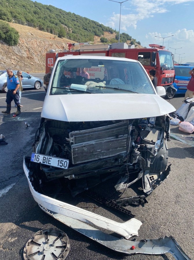 Nurdağı yönüne giden Tahsin Güneş (51) yönetimindeki 16 BIE 150 minibüs, sol arka lastiğinin patlamasıyla kontrolden çıkıp, yol kenarındaki bariyerlere çarptıktan sonra takla atarak devrildi.
