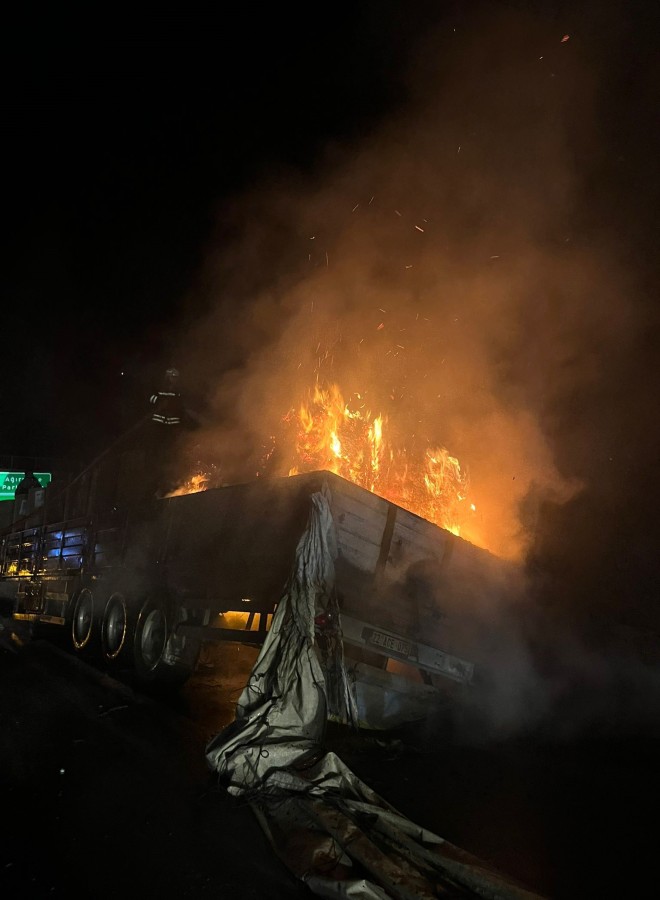 Durumu fark eden tır şoförü Uçar, dorseyi boşandırarak aracını güvenli bölgeye park etti. İhbar üzerine gelen itfaiye ekipleri yangına müdahale etti.