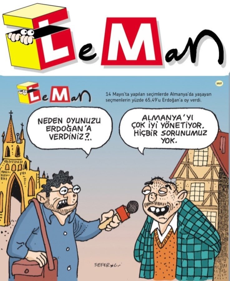 Haftalık mizah ve karikatür dergisi LeMan, bu haftaki kapağına Cumhurbaşkanlığı seçiminde cumhurbaşkanı adayı Recep Tayyip Erdoğan'ın Almanya'dan aldığı oy oranını taşıdı.