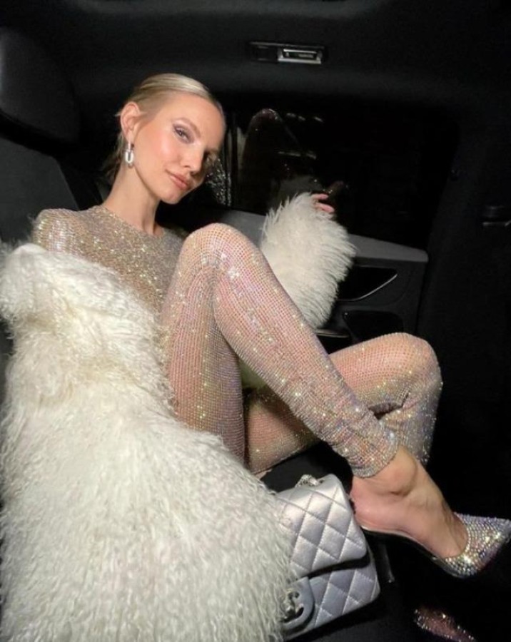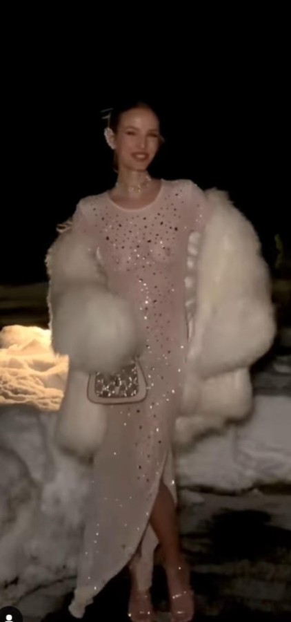 Baştan aşağı transparan beyaz bir elbise giyen Leonie Hanne kombinini beyaz kürkü ile tamamladı.
