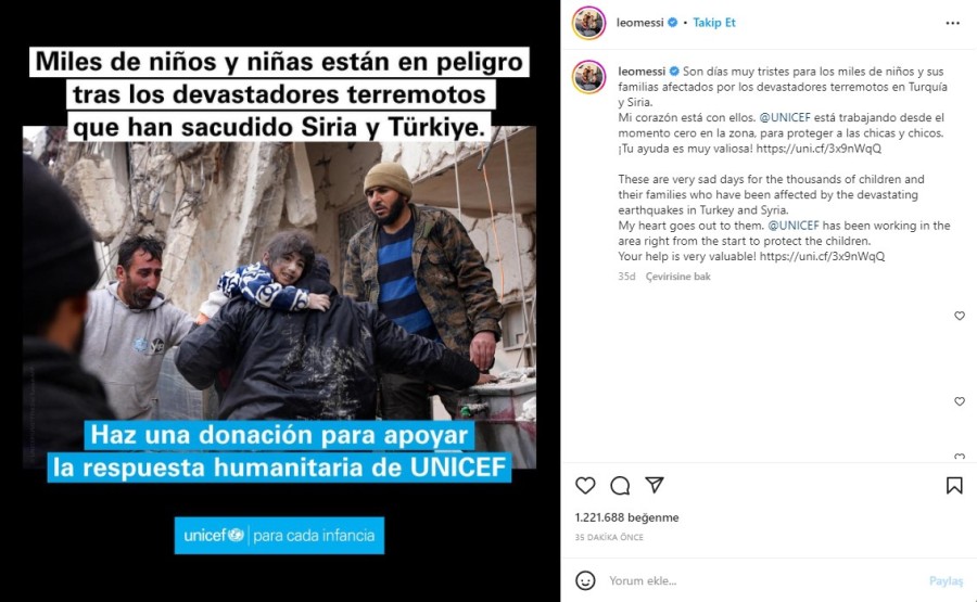 Lionel Messi, Türkiye'de yaşanan depremler nedeniyle etkilenen insanlar için bir mesaj paylaştı. Arjantinli yıldız, "Türkiye ve Suriye'deki yıkıcı depremlerden etkilenen binlerce çocuk ve aileleri için çok üzücü günler. Kalbim onlarla. UNICEF kız ve erkek çocuklarını korumak için depremin başından bu yana bölgede çalışıyor" açıklamasında bulundu.