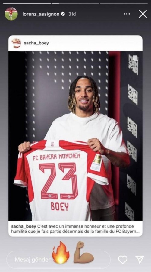 Galatasaray'ın gözdesi Lorenz Assignon, Sacha Boey'nin Bayern Münih'e transferine ilişkin iki paylaşım gerçekleştirdi. Boey'un Bayern'e transferi konusunda düşüncelerini ifade ettiği paylaşımı emojiler ile atan Fransız oyuncu, Boey'un reels videosunu da paylaştı.