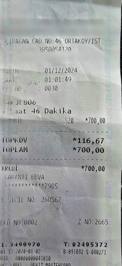 Fişte yer alan bilgilere göre, araç sahibi otoparkı yalnızca 1 saat 46 dakika kullandı. KDV dahil toplam ücret 700 TL olarak faturalandırıldı.