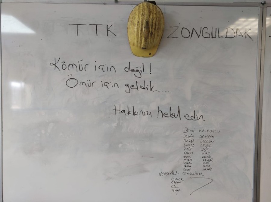 Muhammed'i kurtaran Türkiye Taşkömürü Kurumu (TTK) Zonguldak ekibi, çalışma tahtasına "Kömür için değil! Ömür için geldik... Hakkınızı helal edin" yazdı.