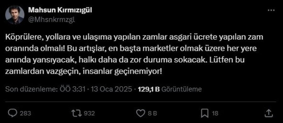 Sanatçı Mahsun Kırmızıgül, otoyol, köprü ve tünellere gelen zamma tepki gösterdi. Kırmızıgül, "Lütfen bu zamlardan vazgeçin, insanlar geçinemiyor!" dedi.