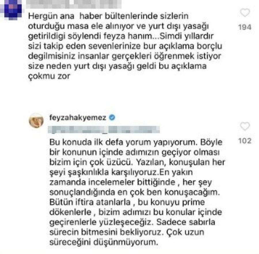 Instagram'da bir takipçisinin "Her gün ana bültenlerinde sizlerin oturduğu masa ele alınıyor ve yurt dışı yasağı getirildiği söylendi. Şimdi yıllardır sizi takip edenlere bir açıklama borçlu değil misiniz?" yorumuna cevap veren Feyza Hakyemez Başar, "Bu konuda ilk defa yorum yapıyorum. Böyle bir konunun içinde adımızın geçiyor olması bizim için çok üzücü. Yazılan, konuşulan her şeyi şaşkınlıkla karşılıyoruz. En yakın zamanda incelemeler bittiğinde, her şey sonuçlandığında en çok ben konuşacağım. Bütün iftira atanlarla, bu konuyu prime dökenlerle, bizim adımızı bu konular içinde geçirenlerle yüzleşeceğiz. Sadece sabırla sürecin bitmesini bekliyoruz. Çok uzun süreceğini düşünmüyorum" dedi.