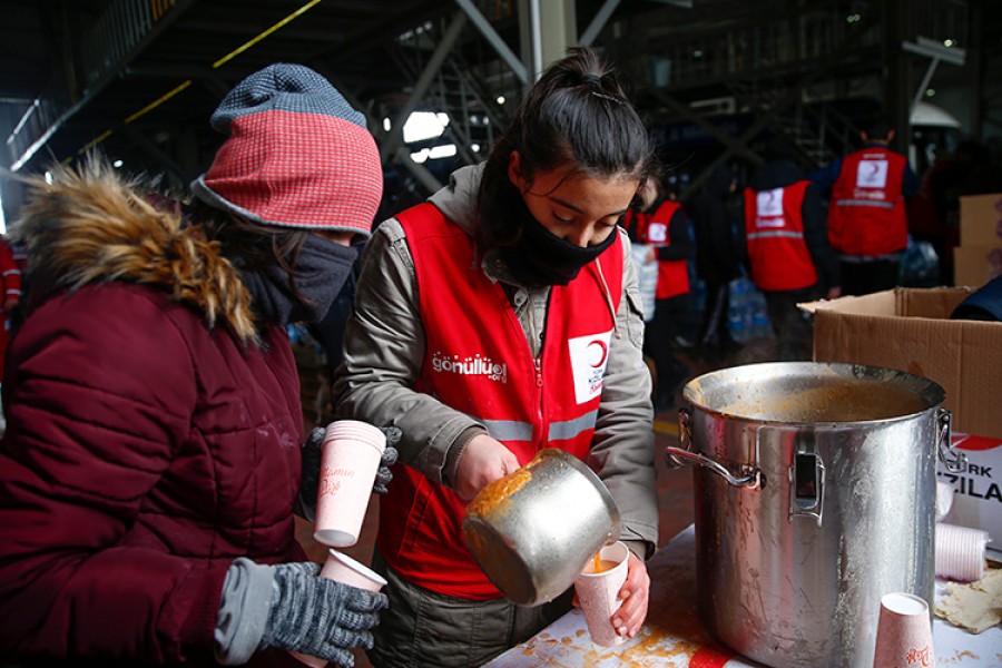 Kahramanmaraş merkezli depremlerden etkilenen Malatya'da, otogarda kurulan merkezde günlük yaklaşık 30 bin depremzedeye sıcak yemek servisi yapılıyor.