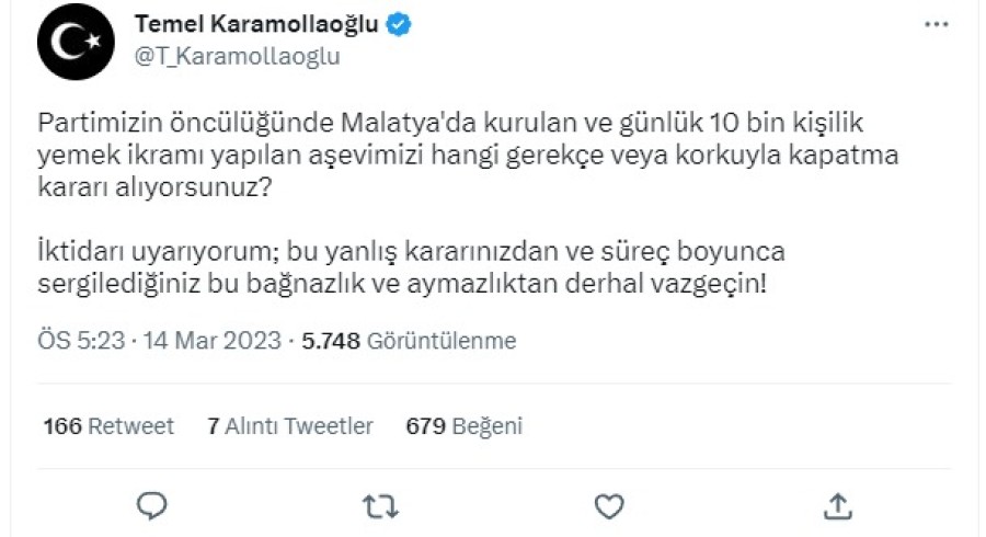 "Partimizin öncülüğünde Malatya'da kurulan ve günlük 10 bin kişilik yemek ikramı yapılan aşevimizi hangi gerekçe veya korkuyla kapatma kararı alıyorsunuz? İktidarı uyarıyorum; bu yanlış kararınızdan ve süreç boyunca sergilediğiniz bu bağnazlık ve aymazlıktan derhal vazgeçin!"