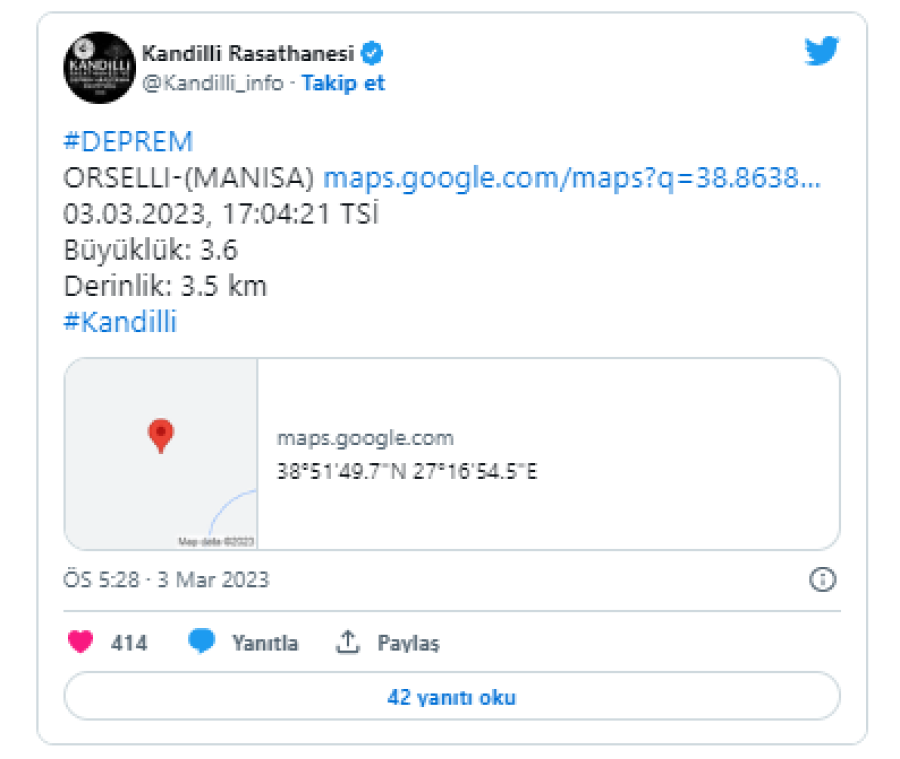 Edinilen bilgilere göre, Manisa'da 3.6 büyüklüğünde bir deprem meydana geldi.