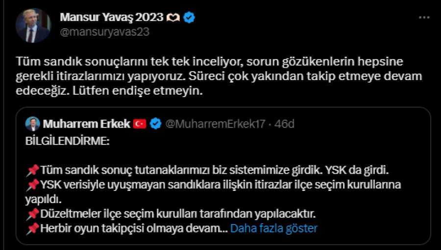 ABB Başkanı Mansur Yavaş ise gerekli itirazların yapıldığını belirterek, "Tüm sandık sonuçlarını tek tek inceliyor, sorun gözükenlerin hepsine gerekli itirazlarımızı yapıyoruz. Süreci çok yakından takip etmeye devam edeceğiz. Lütfen endişe etmeyin." ifadelerini yazdı.