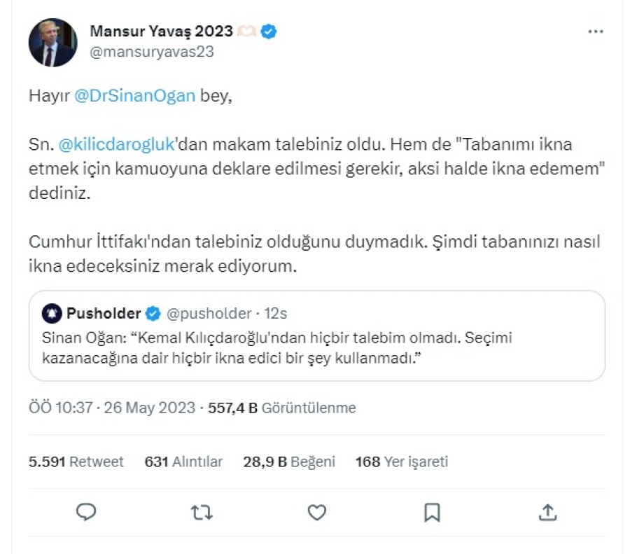 "Hayır @DrSinanOgan bey, Sn. @kilicdarogluk'dan makam talebiniz oldu. Hem de 'Tabanımı ikna etmek için kamuoyuna deklare edilmesi gerekir, aksi halde ikna edemem' dediniz. Cumhur İttifakı'ndan talebiniz olduğunu duymadık. Şimdi tabanınızı nasıl ikna edeceksiniz merak ediyorum."