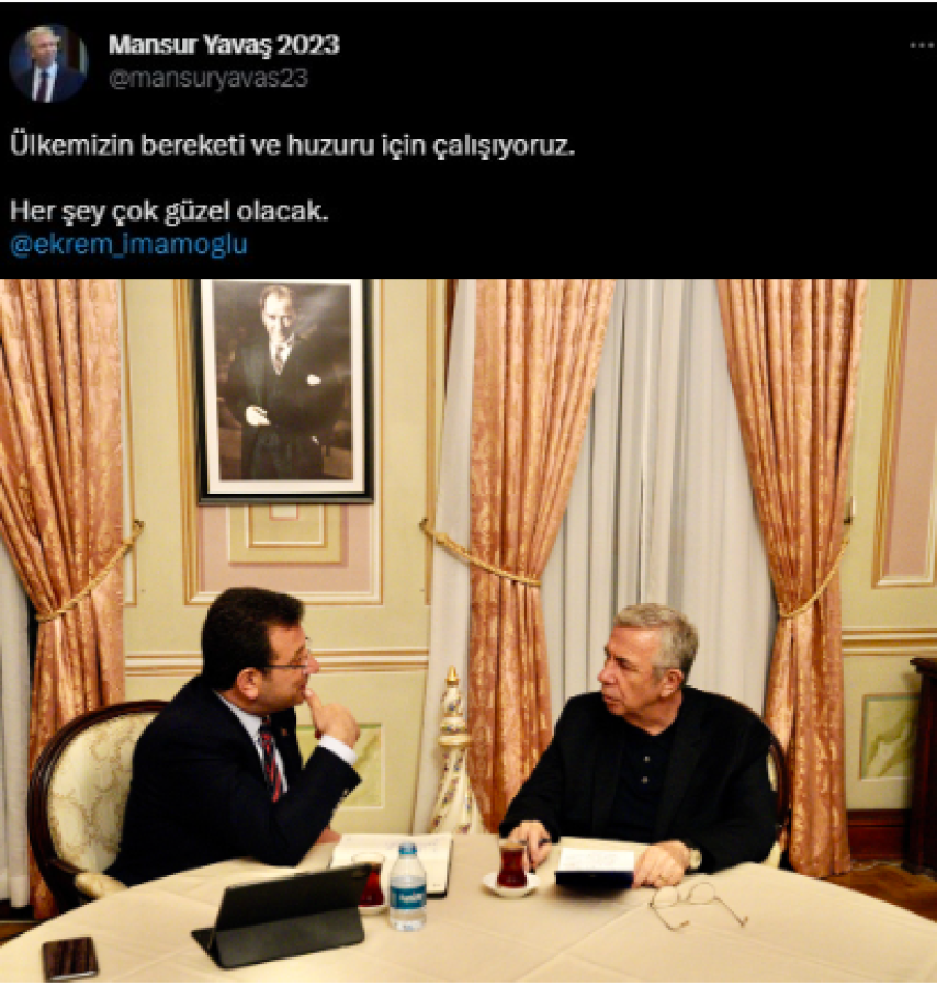 Yavaş, seçim çalışmalarının paylaşıldığı resmi hesapta, İmamoğlu'na yer verdi. İBB Başkanı ile masada konuştuğu pozu paylaşan Yavaş, İmamoğlu'nu da etiketleyerek "Ülkemizin bereketi ve huzuru için çalışıyoruz. Her şey çok güzel olacak." ifadesini yazdı.