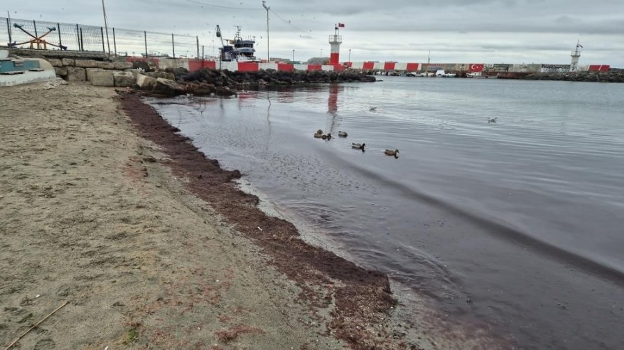 Marmara Denizi'nin Tekirdağ kıyılarında lodosun ardından yoğun miktarda kızıl yosun birikimi meydana geldi.