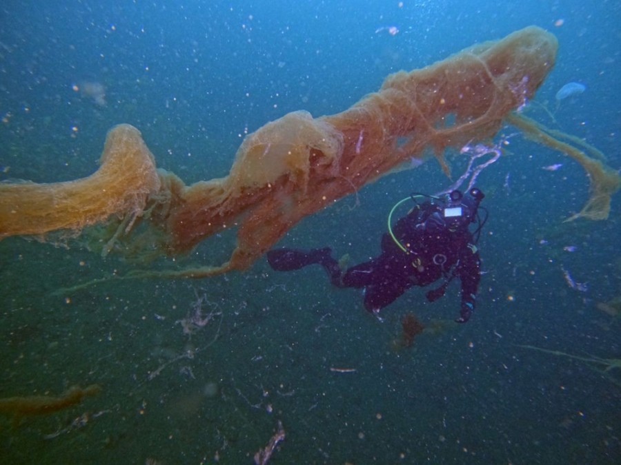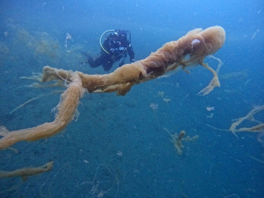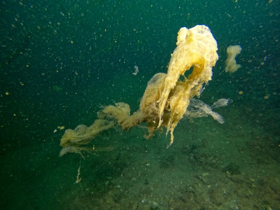 Kocaeli'nin Gölcük ilçesine bağlı Değirmendere'de, su üstünden görünmeyen müsilajın su altındaki yayılımı kaydedildi.