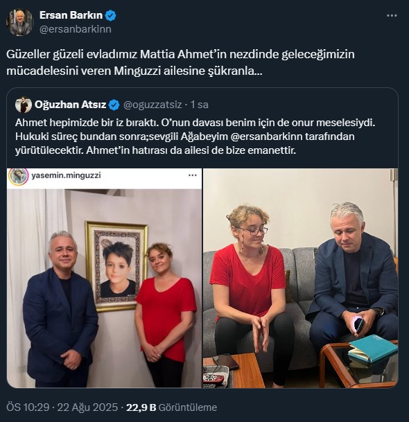 Minguzzi'nin annesi Yasemin Minguzzi ile fotoğrafını alıntılayan Avukat Barkın, "Güzeller güzeli evladımız Mattia Ahmet'in nezdinde geleceğimizin mücadelesini veren Minguzzi ailesine şükranla..." dedi.