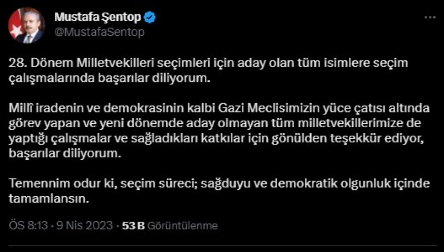 "28. Dönem Milletvekilleri seçimleri için aday olan tüm isimlere seçim çalışmalarında başarılar diliyorum. Millî iradenin ve demokrasinin kalbi Gazi Meclisimizin yüce çatısı altında görev yapan ve yeni dönemde aday olmayan tüm milletvekillerimize de yaptığı çalışmalar ve sağladıkları katkılar için gönülden teşekkür ediyor, başarılar diliyorum. Temennim odur ki, seçim süreci; sağduyu ve demokratik olgunluk içinde tamamlansın."