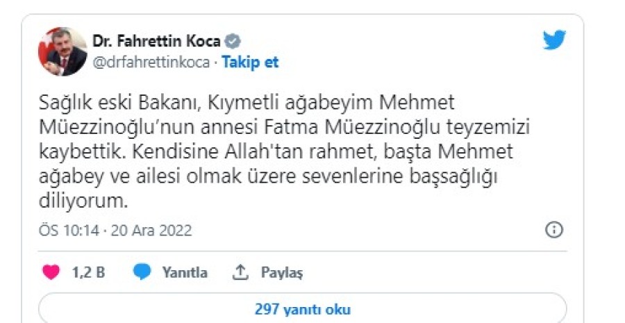 "Sağlık eski Bakanı, Kıymetli ağabeyim Mehmet Müezzinoğlu'nun annesi Fatma Müezzinoğlu teyzemizi kaybettik. Kendisine Allah'tan rahmet, başta Mehmet ağabey ve ailesi olmak üzere sevenlerine başsağlığı diliyorum."