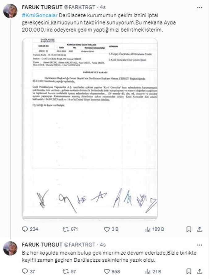 Kızıl Goncalar dizisinin yapımcısı Faruk Turgut Okmeydanı Darülaceze'deki çekim izinlerinin iptal edilmesine tepki gösterdi.