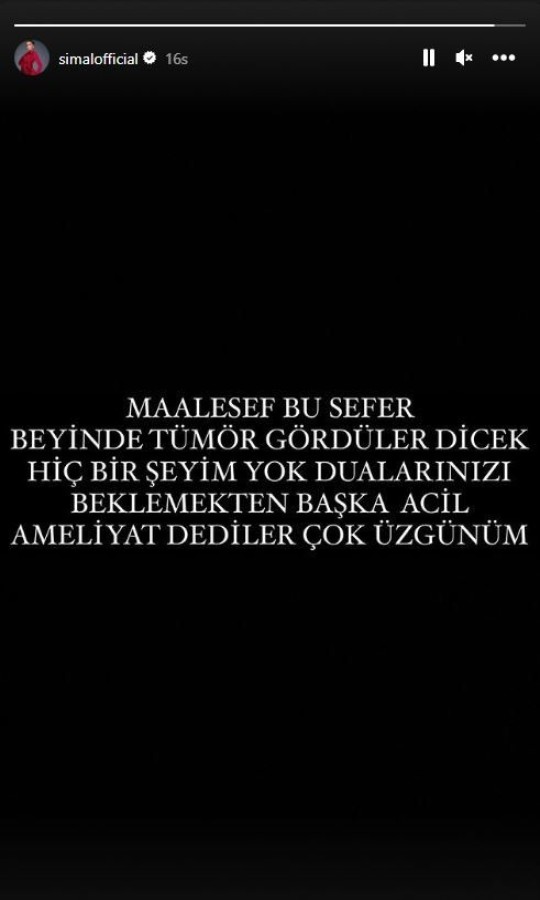 Kötü haberi Instagram hesabından duyuran Şimal, "Maalesef bu sefer beyinde tümör gördüler. Diyecek bir şeyim yok. Dualarınızı beklemekten başka... Acil ameliyat dediler. Çok üzgünüm" ifadelerini kullandı.