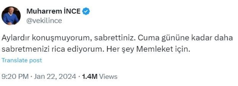 Memleket Partisi Genel Başkanı Muharrem İnce sosyal medya hesabı üzerinden "Aylardır konuşmuyorum, sabrettiniz. Cuma gününe kadar daha sabretmenizi rica ediyorum." paylaşımında bulundu.