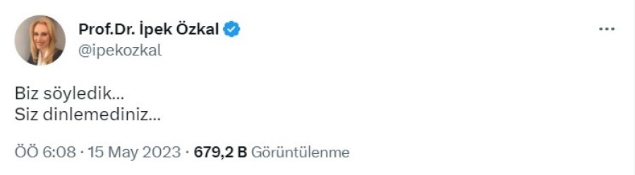 Memleket Partisi Sözcüsü İpek Özkal Sayan, 14 Mayıs milletvekili ve cumhurbaşkanı seçimlerinin ardından paylaşım yaptı.