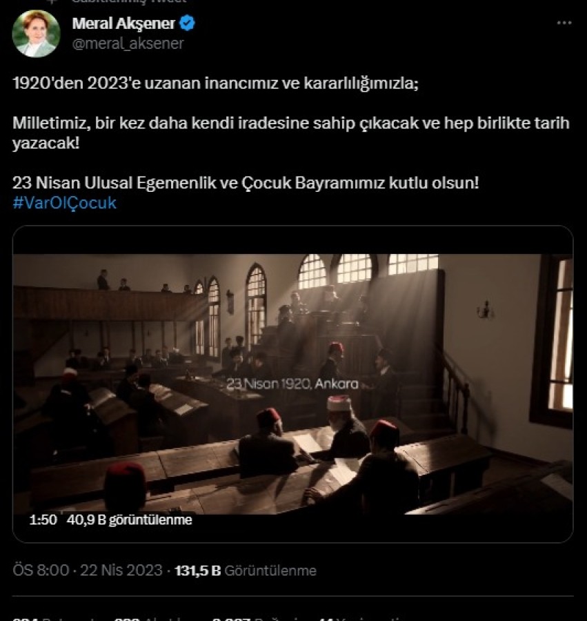 İYİ Parti Genel Başkanı Meral Akşener, sosyal medya hesabındaki paylaşımında, "1920'den 2023'e uzanan inancımız ve kararlılığımızla milletimiz, bir kez daha kendi iradesine sahip çıkacak ve hep birlikte tarih yazacak. 23 Nisan Ulusal Egemenlik ve Çocuk Bayramımız kutlu olsun" ifadelerine yer verdi.