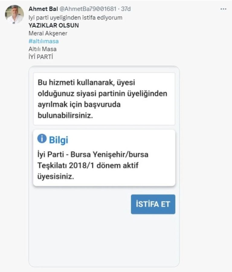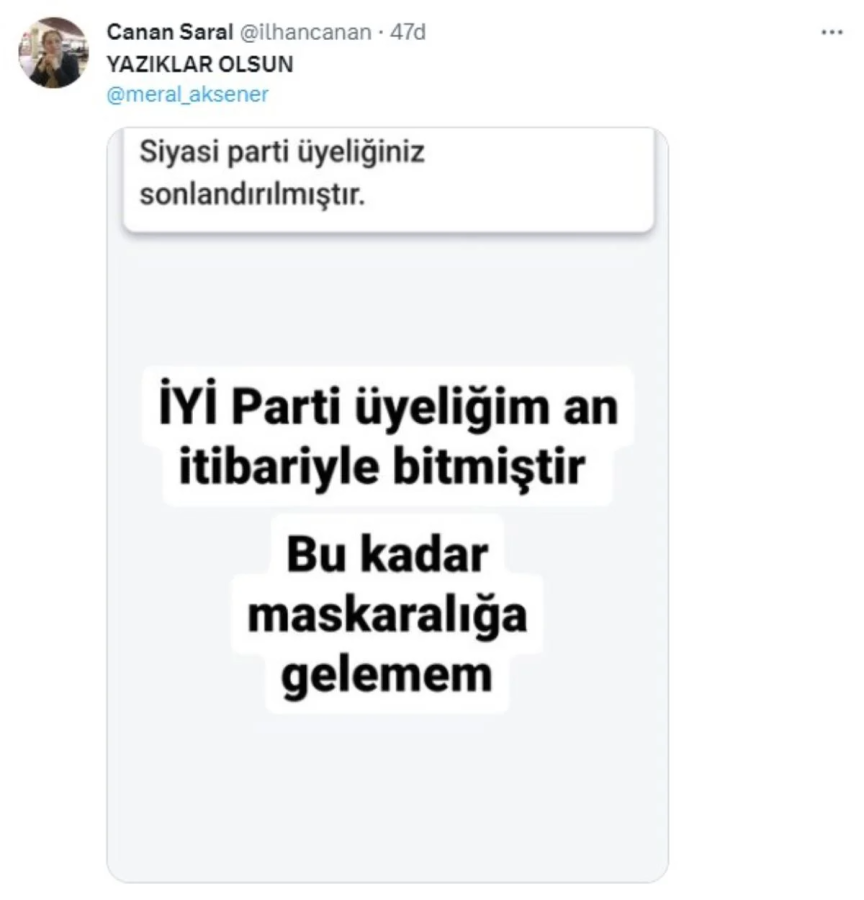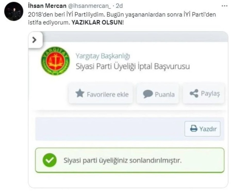 "Yazıklar Olsun" etiketi ile yapılan paylaşımlarda, bazı İYİ Partili kullanıcılar parti üyeliğinden istifa ettiklerine ilişkin görseller paylaşarak tepkilerini dile getirdi.