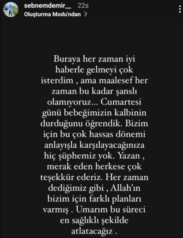 Mert Ramazan Demir'in yengesi Şebnem Demir, Instagram hesabından yaşadığı acıyı paylaşarak "Buraya her zaman iyi haberle gelmeyi çok isterdim ama maalesef her zaman bu kadar şanslı olamıyoruz. Cumartesi günü bebeğimizin kalbinin durduğunu öğrendik. Bizim için bu çok hassas dönemi anlayışla karşılayacağınızı hiç şüphemiz yok. Yazan, merak eden herkese çok teşekkür ederiz. Her zaman dediğimiz gibi Allah'ın bizim için farklı planları varmış. Umarım bu süreci en sağlıklı şekilde atlatacağız" ifadelerini kullandı.