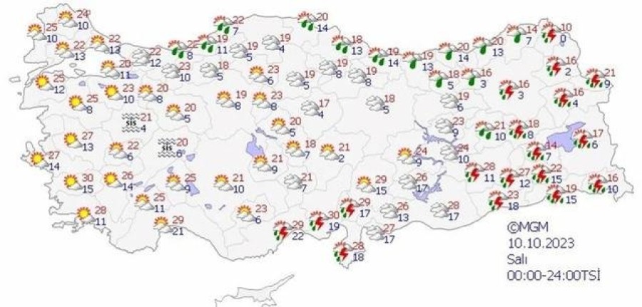 Meteoroloji Genel Müdürlüğü haftalık hava tahmin raporunu yayımladı. Raporda 12 il için sarı kodu gök gürültülü sağanak yağış ve kuvvetli rüzgar uyarısında bulunuldu. Vatandaşlara "Ani sel, su baskını, yıldırım, ani kuvvetli rüzgar ve kısa süreli fırtına ile ulaşımda aksamalar gibi olumsuzluklara karşı dikkatli ve tedbirli olunmalıdır. Kuvvetli yağışların 11.10.2023 Çarşamba sabah saatlerinden itibaren etkisini kaybetmesi bekleniyor" uyarısı yapıldı.