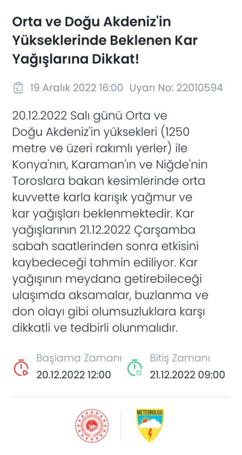 Meteoroloji Genel Müdürlüğü'nün değerlendirmesinde salı günü Orta ve Doğu Akdeniz'in yüksekleri (1250 metre ve üzeri rakımlı yerler) ile Konya'nın, Karaman'ın ve Niğde'nin Toroslara bakan kesimlerinde orta kuvvette karla karışık yağmur ve kar yağışları beklendiği duyuruldu.