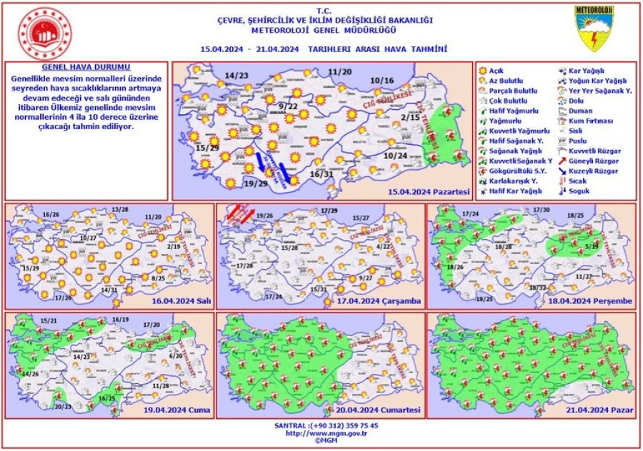 Meteoroloji Genel Müdürlüğü tarafından yapılan açıklamada; "Haftalık Hava Tahmini (14- 20 Nisan 2024); Mevsim normalleri üzerinde seyreden hava sıcaklıklarının; hafta başında yükselmeye devam edeceği ve ülke genelinde mevsim normallerinin 4 ila 10 derece üzerine çıkacağı tahmin ediliyor" denildi.